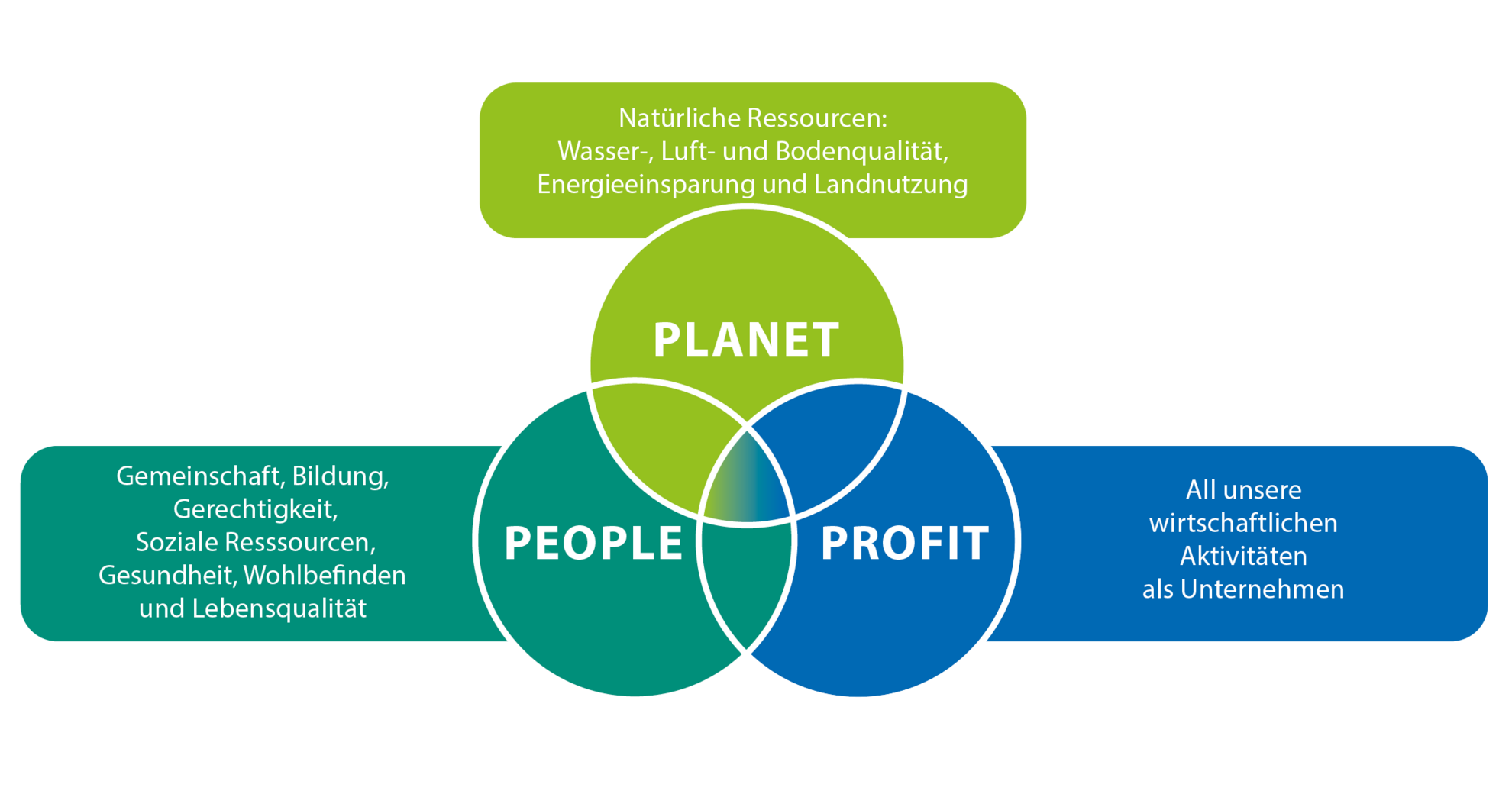 Als Unternehmen ist es für uns essenziell, ökonomisch erfolgreich zu sein. Nur so können wir unserer ökologischen und gesellschaftlichen Verantwortung nachkommen. Entscheidend hierbei ist unseres Erachtens aber: ökonomischer Erfolg (profit) nicht um jeden Preis. Und vor allem nicht auf Kosten unserer Umwelt (planet) und anderer (people - stellvertretend für alle Lebewesen).