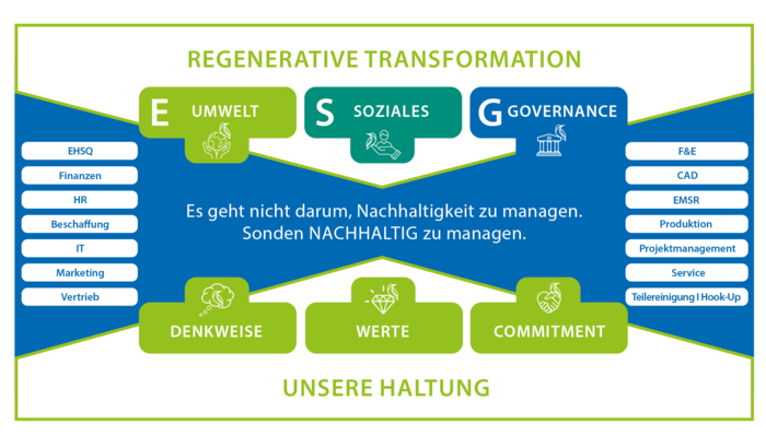 Basierend auf unserer Denkweise, unseren Werten und unserer Haltung orientieren wir uns an den drei Säulen Umwelt, Soziales und Governance, um regenerativ zu werden zu bleiben.